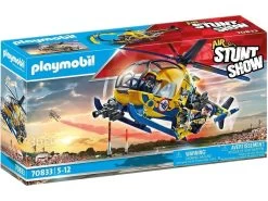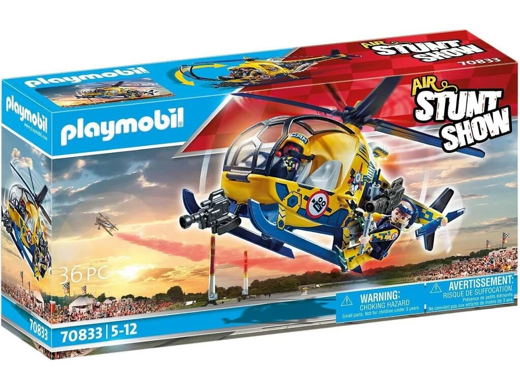 Prepárate para tomar el control de uno de los helicópteros más frenéticos y trepidantes, monta junto al piloto y el cámara, y toma las imágenes más impresionantes del show de avionetas que ha llegado a la ciudad. ¡Emoción, pasión y adrenalina al alcance de tu mano! ¡Filma tus acrobacias más alucinantes y recrea el show más fascinante junto al resto de tus packs Playmobil Air Stunt Show!