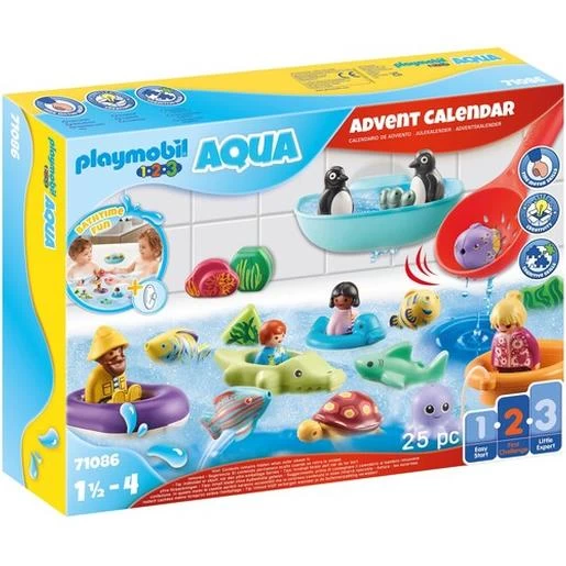 El Calendario de Adviento Playmobil 1.2.3 Diversión en el baño ofrece gran diversión a la hora del baño para los más pequeños. Las coloridas figuras y animales de Playmobil 1.2.3 se esconden detrás de 24 pequeñas puertas para una emocionante temporada navideña. Los productos Playmobil 1.2.3 Aqua especialmente diseñados proporcionan la máxima diversión en la bañera. Con la ayuda de la ventosa, la bandeja de recogida se fija simplemente al borde de la bañera o a los azulejos de la pared.