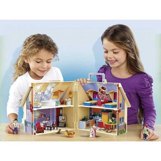 Desde la mañana hasta la noche, la familia Playmobil vive emocionantes aventuras en la gran casa de muñecas, que se puede transportar. Da igual que estén cocinando en la cocina, chapoteando en el baño o viendo la televisión en el salón; el tiempo nunca se detiene en la moderna casa de muñecas Playmobil.