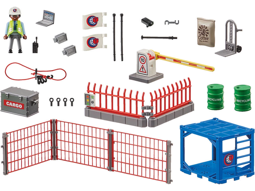 Incluye: 1 figura con uniforme de trabajo y casco, 1 contenedor de color azul, 1 vaya triple, 1 verja de seguridad, 2 bidones verdes, 1 barrera de seguridad para el acceso, 3 sacos de café, 2 focos y muchos más accesorios de juego.