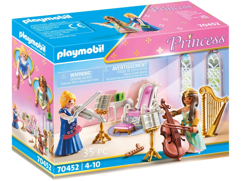 Incluye: 1 figura adulta de una princesa rubia, 1 figura adulta de una princesa morena, 1 vestido azul para una de las princesas, 1 falda para otra de las princesas, 2 partituras de música, 1 violín blanco, 1 arco blanco, 1 violonchelo marrón, 1 arco marrón, 2 atriles de color amarillo, 1 silla presencial de color rosa y blanco, 1 mesita blanca de pared, 2 libros de música, 1 alfombra blanca, 1 arpa y más.