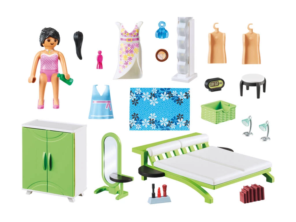 Incluye: 1 dormitorio, 1 muñeco, accesorios.