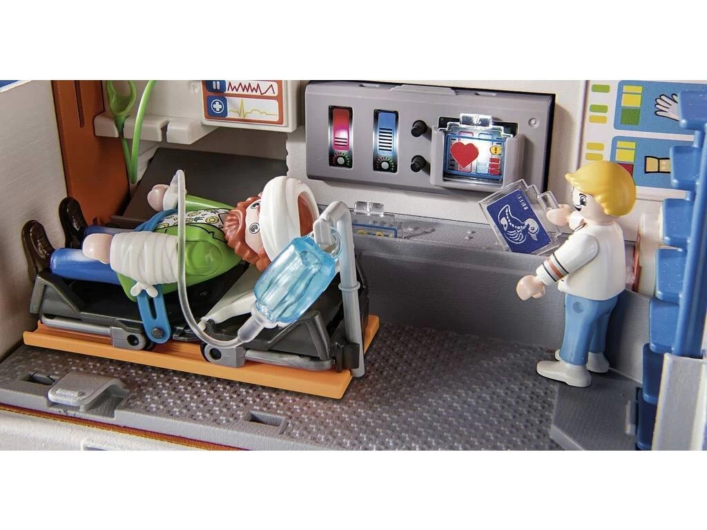 Incluye: Una caja de almacenaje ilustrada, una figura paciente, una figura sanitario, una ambulancia, una camilla, un botiquín y otros accesorios mas.