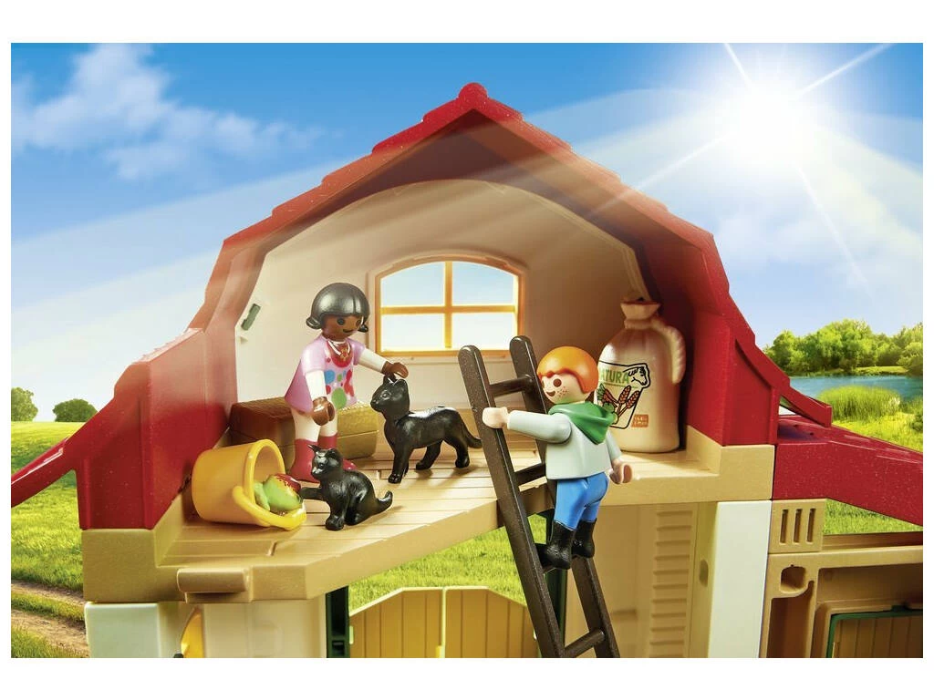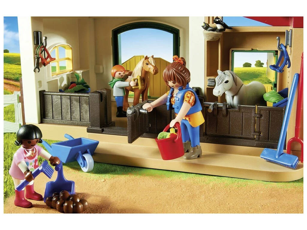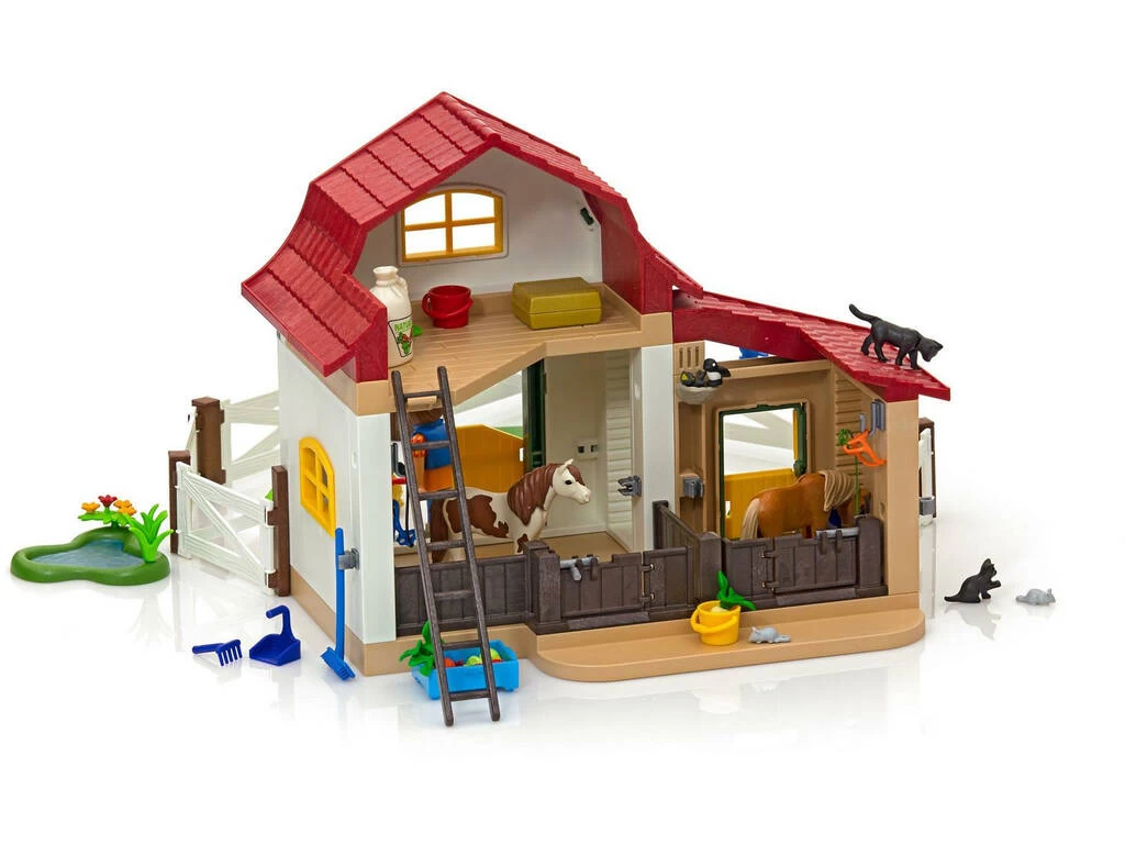 Contenido: 1 granja, 7 vallas, 3 ponis, 3 muñecos Playmobil, pájaros, gatos, carretilla, herramientas, cascos, estanque, cubos, escalera, accesorios para los ponis ¡y mucho más accesorios que te invitamos a descubrir!.