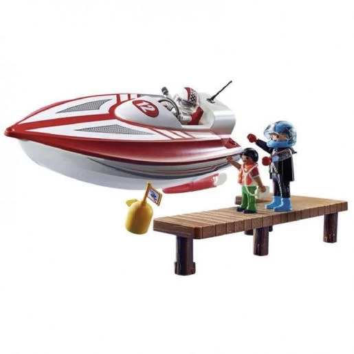 Playmobil Speedboot con motor subacuático con 2 conductores y 1 niño, para reproducir carreras en barco, también se puede usar como juguete al aire libre.