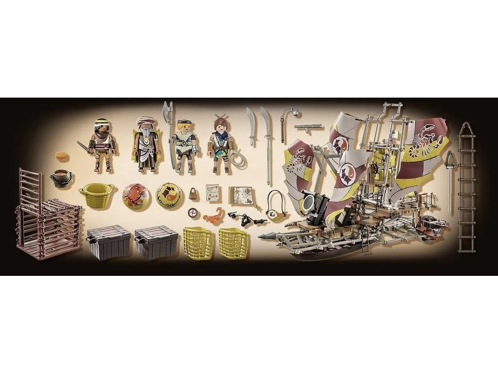 Incluye: 4 figuras de acción con look especial, 1 barco rompearenas con cañón de fuelle, ariete desplazable con red para bolas de espuma, dos cañones de veneno en plataformas móviles con balas de esponja, jaula extraible, varias escotillas, velas que cambian de posición y muchos más detalles, 5 figuras de escorpión, 2 escaleras, armas y muchos más accesorios de juego.