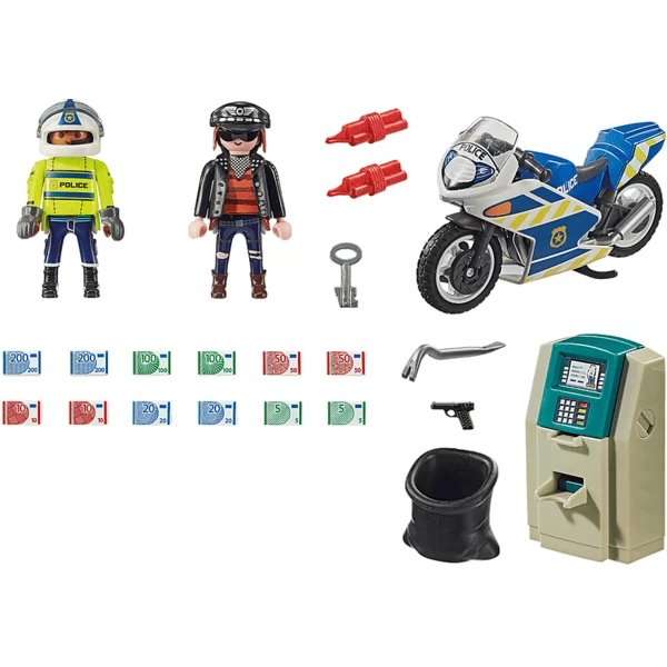 La moto de la policía está persiguiendo al ladrón de dinero.