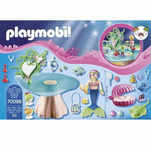 La sirena se prepara enfrente del espejo de coral en el Salón de Belleza con Joya. Con perlas, un colgante para hacerte tu propio collar (collar no incluido) y muchos accesorios. Se puede combinar con 70094 Cala de Sirenas con Cúpula Iluminada. Dimensiones: 21 x 20 x 20cm (LxPxA)