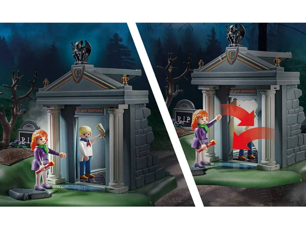 Incluye: 1 figura Scooby-Doo, 1 figura Daphne Blake, 1 figura Fred Jones, 1 figura esqueleto, 1 figura zombie fantasma, 1 gorro especial de mago para Scooby-Doo, 1 base de juego entrada al mausoleo con lápidas, 4 murciélagos, 1 ataúd mágico y muchos accesorios de juego más.
