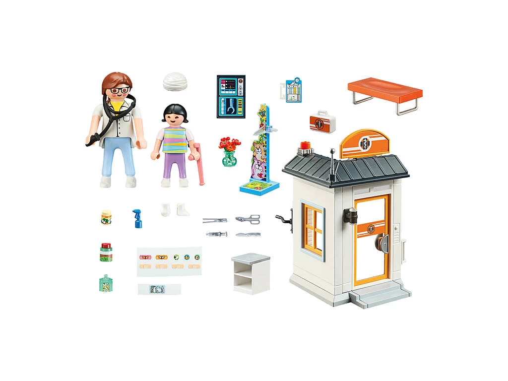 Incluye: 1 figura adulta pediatra, 1 figura infantil con camiseta multicolor y pantalón violeta, 1 clínica con entrada, ventana y decoración, 1 camilla, 1 metro infantil, 1 muleta, 1 estetoscopio, 1 macetero, 1 botiquín, 1 mueble y muchos más accesorios de juego.