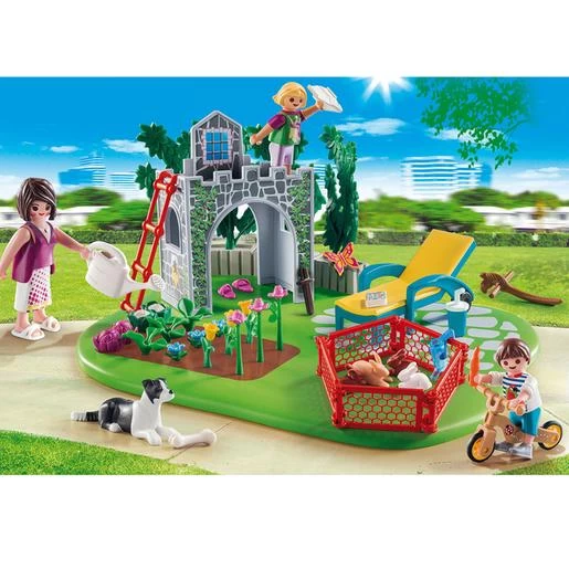 En el jardín de Playmobil Country, los niños alimentan a los animales, mientras la madre riega las plantas en el jardín.