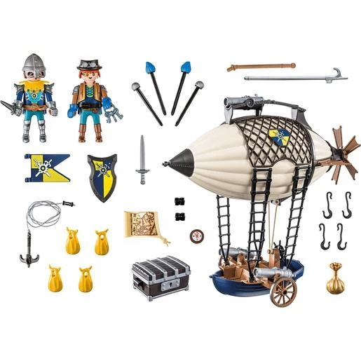 El set de juego incluye los personajes de Novelmore, el inventor Dario DaVanci y el caballero Bruce Benett, un zepelín con cañones de disparo, flechas de bala de agua, mapa del tesoro, cofre del tesoro, escudo, espada, saco de oro y muchos más extras emocionantes para vivir grandes aventuras de vuelo. El zepelín tiene espacio para dos figuras y puede circular por el suelo con las ruedas.